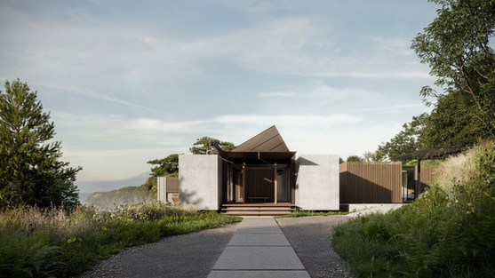 Rear rooms built into the rear bank are of reinforced concrete to create retaining walls and support the green roof over.